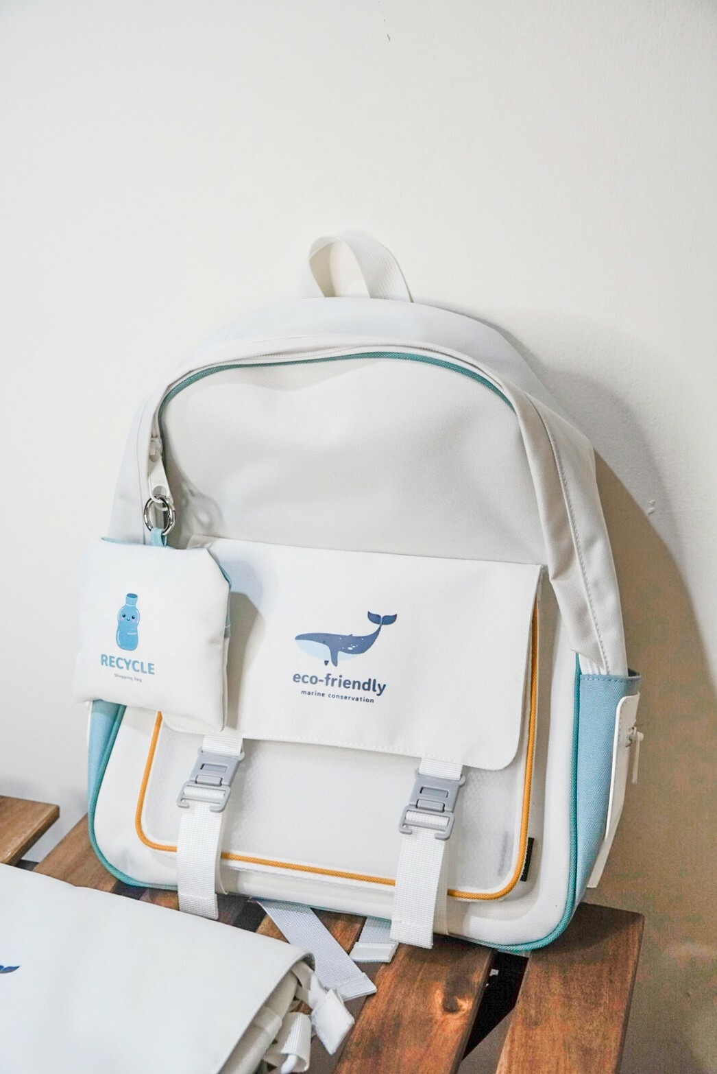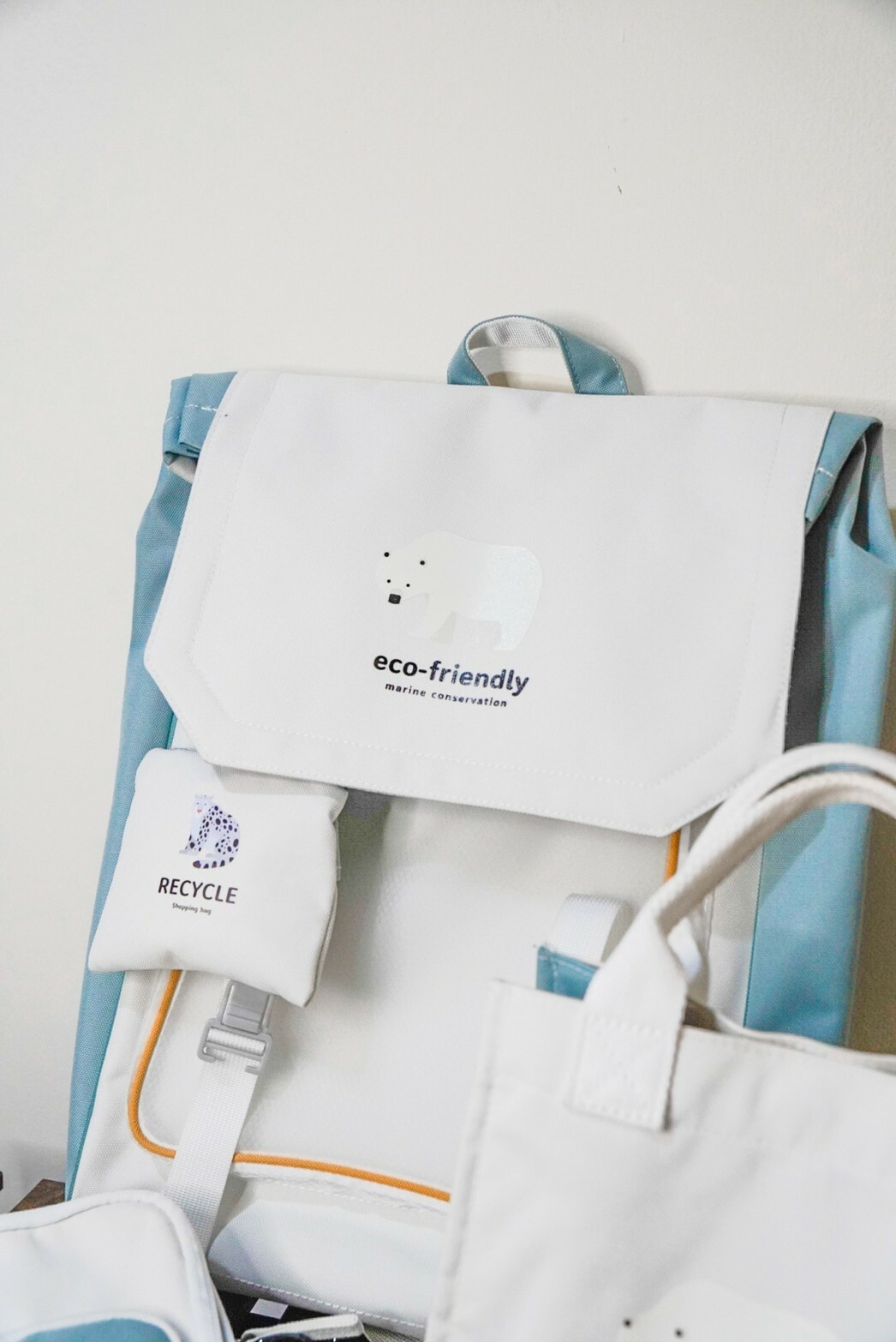 背包材質皆為「回收塑膠、寶特瓶分解而成的再生纖維環保材質」製作而成 !