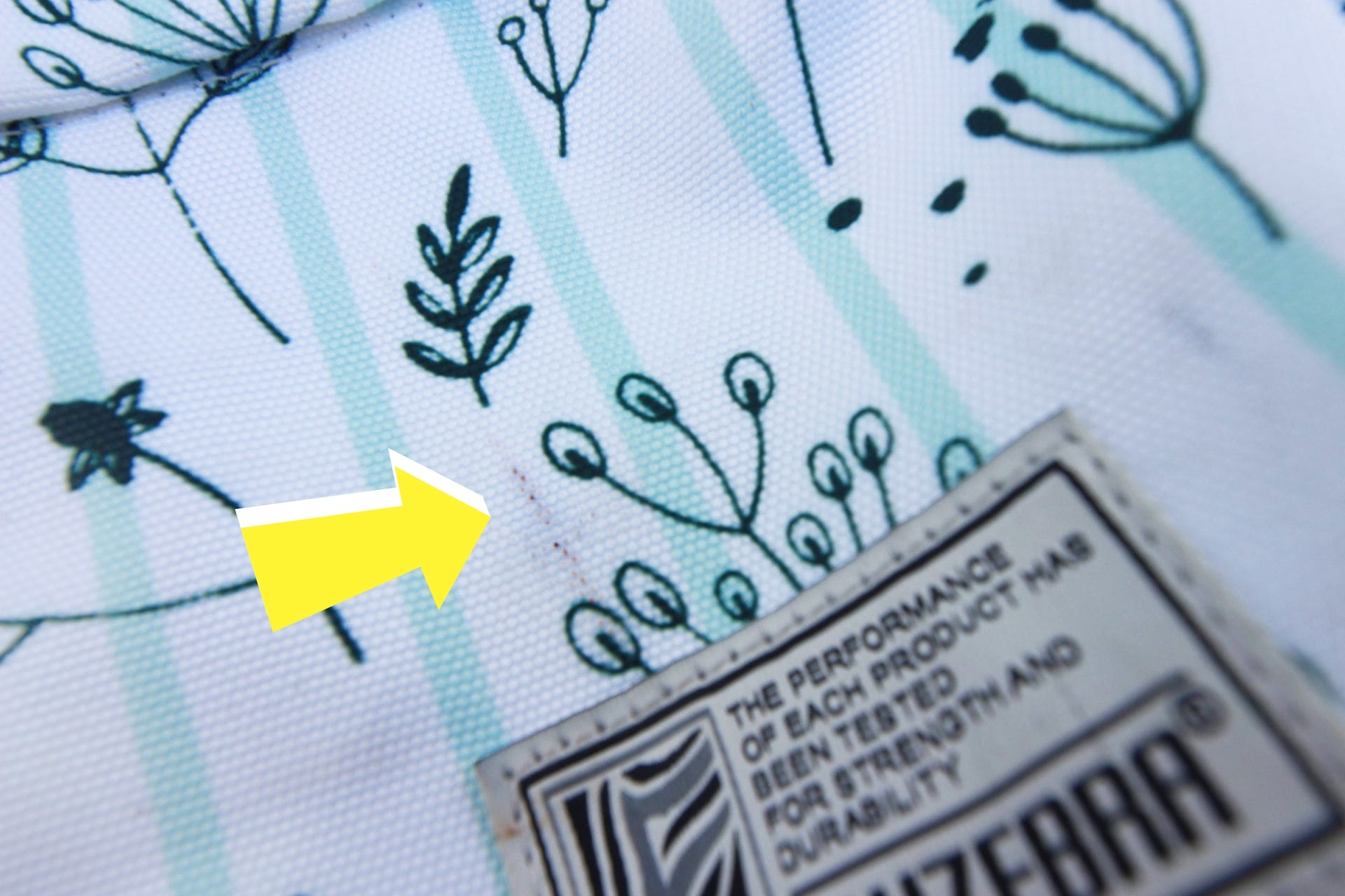 在拉鍊邊角上方有黑色髒污、正面有黑色的小斑點、背帶上有污漬、側面也有明顯的大塊污漬