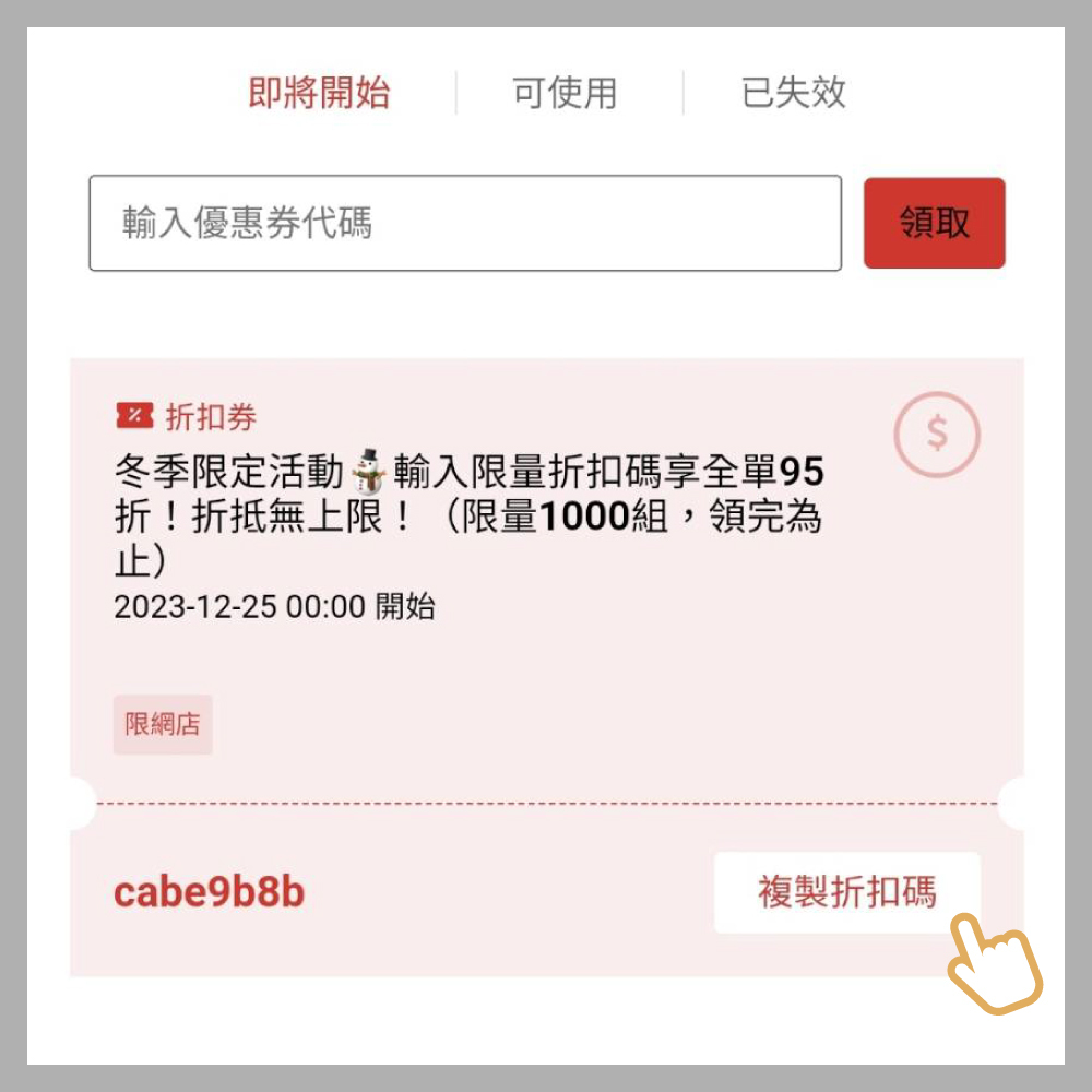 獲得優惠券後請點「查看優惠券」即可獲得一組隨機優惠碼,點選「複製折扣碼」