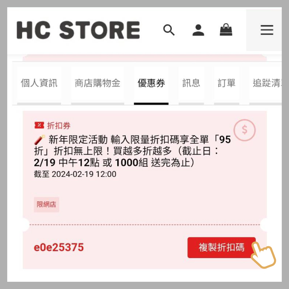 點擊下方圖片就可以領取到95折優惠券囉~祝您購物愉快!