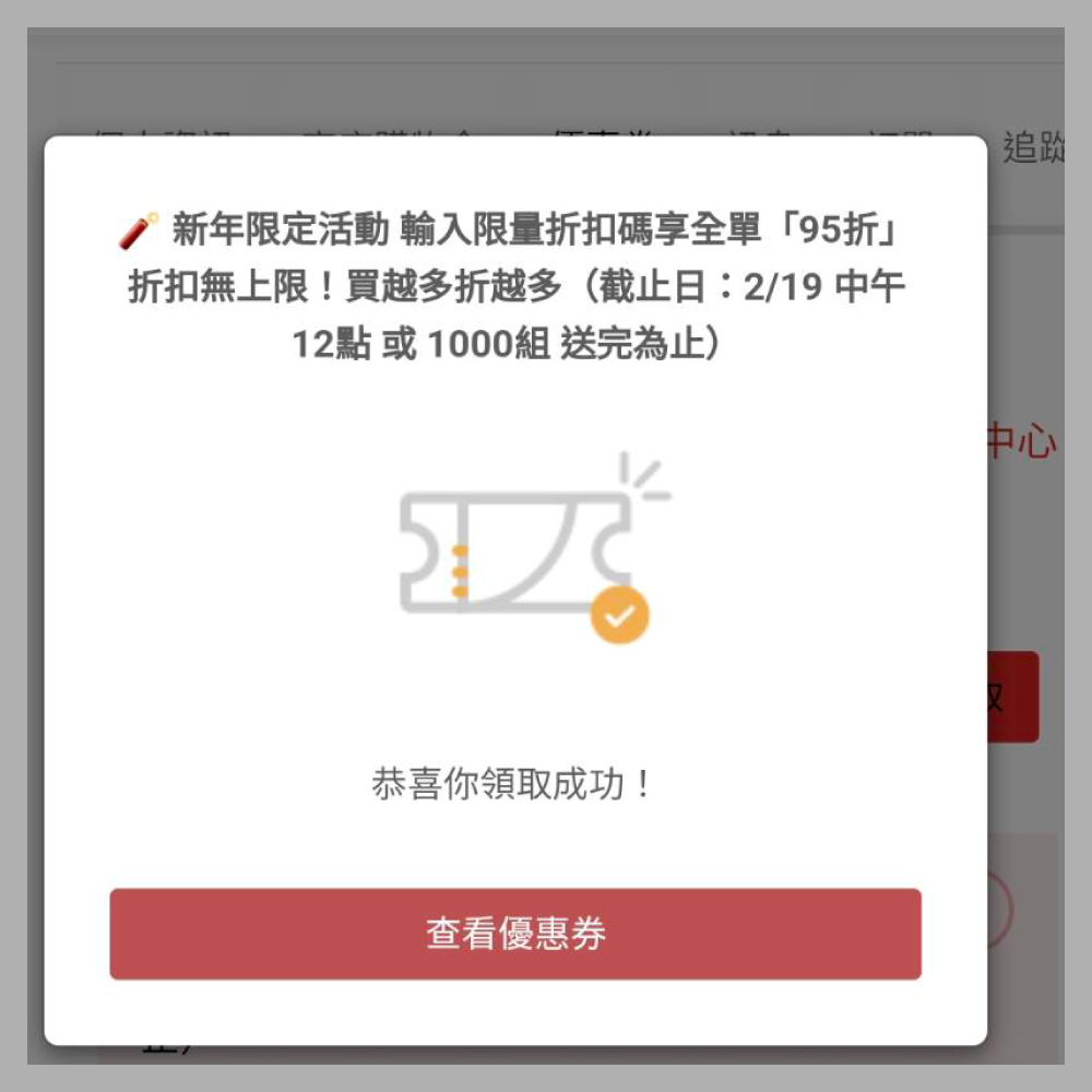 獲得優惠券後請點「查看優惠券」即可獲得一組隨機優惠碼,點選「複製折扣碼」