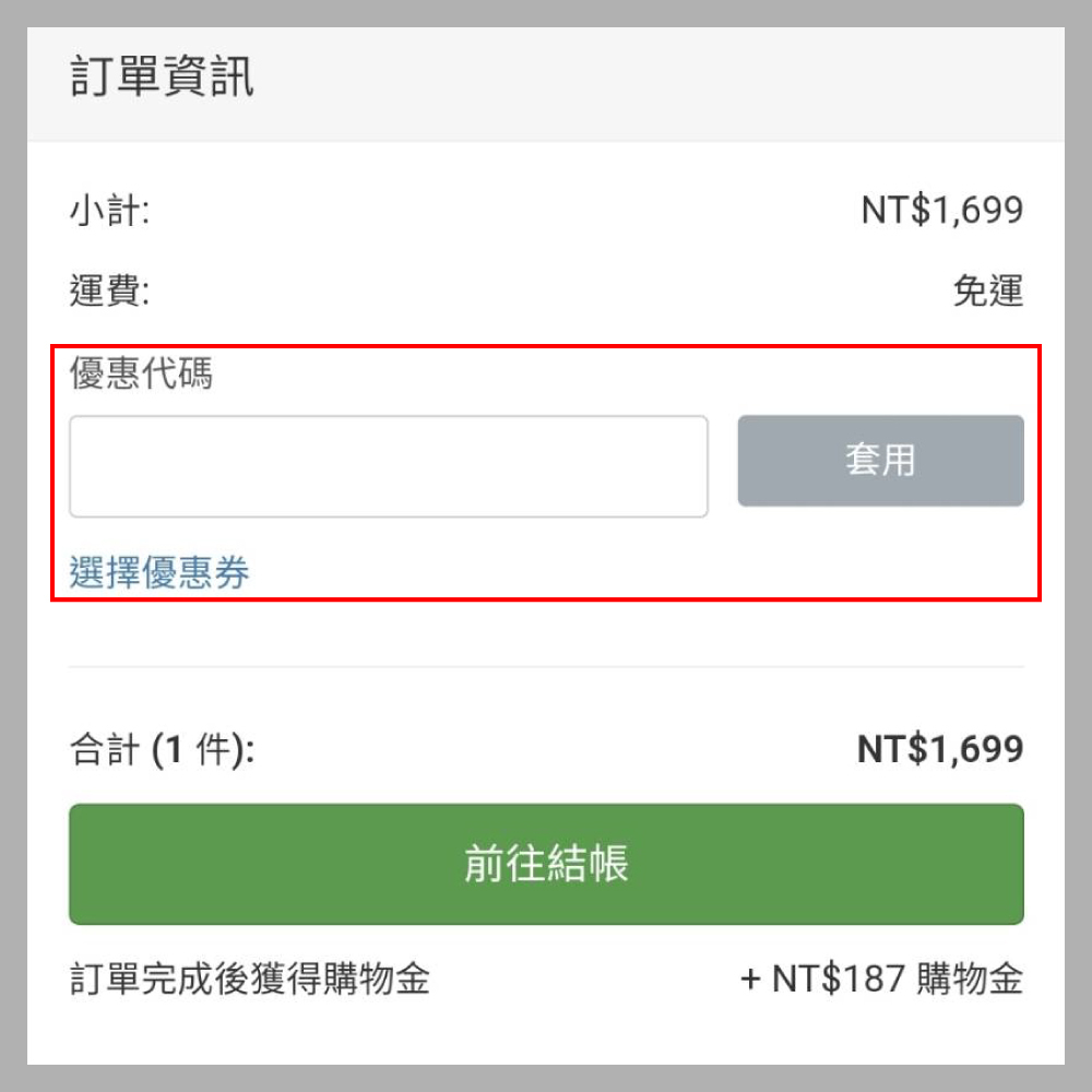 點擊右上角購物車符號並按下前往結帳,頁面往下滑即可找到「使用優惠代碼」欄位並輸入剛剛的隨機優惠碼即可完成折抵
