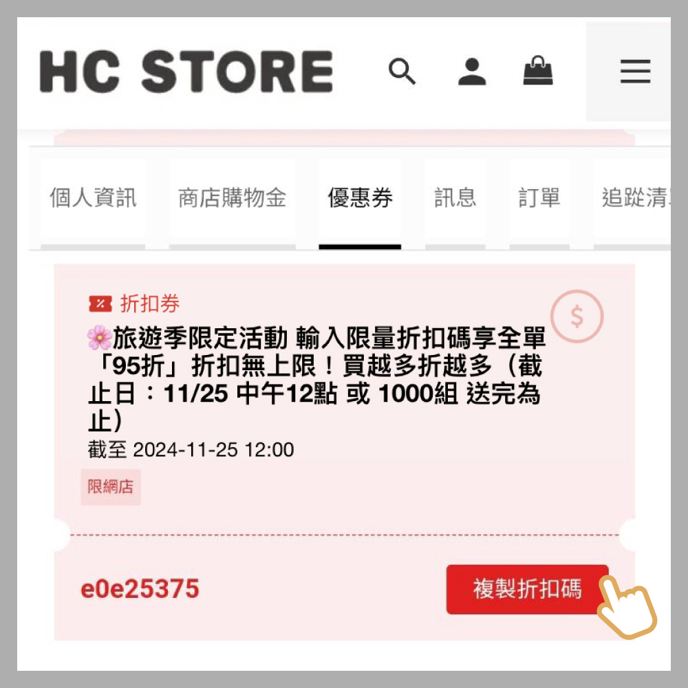 獲得優惠券後請點「查看優惠券」即可獲得一組隨機優惠碼,點選「複製折扣碼」