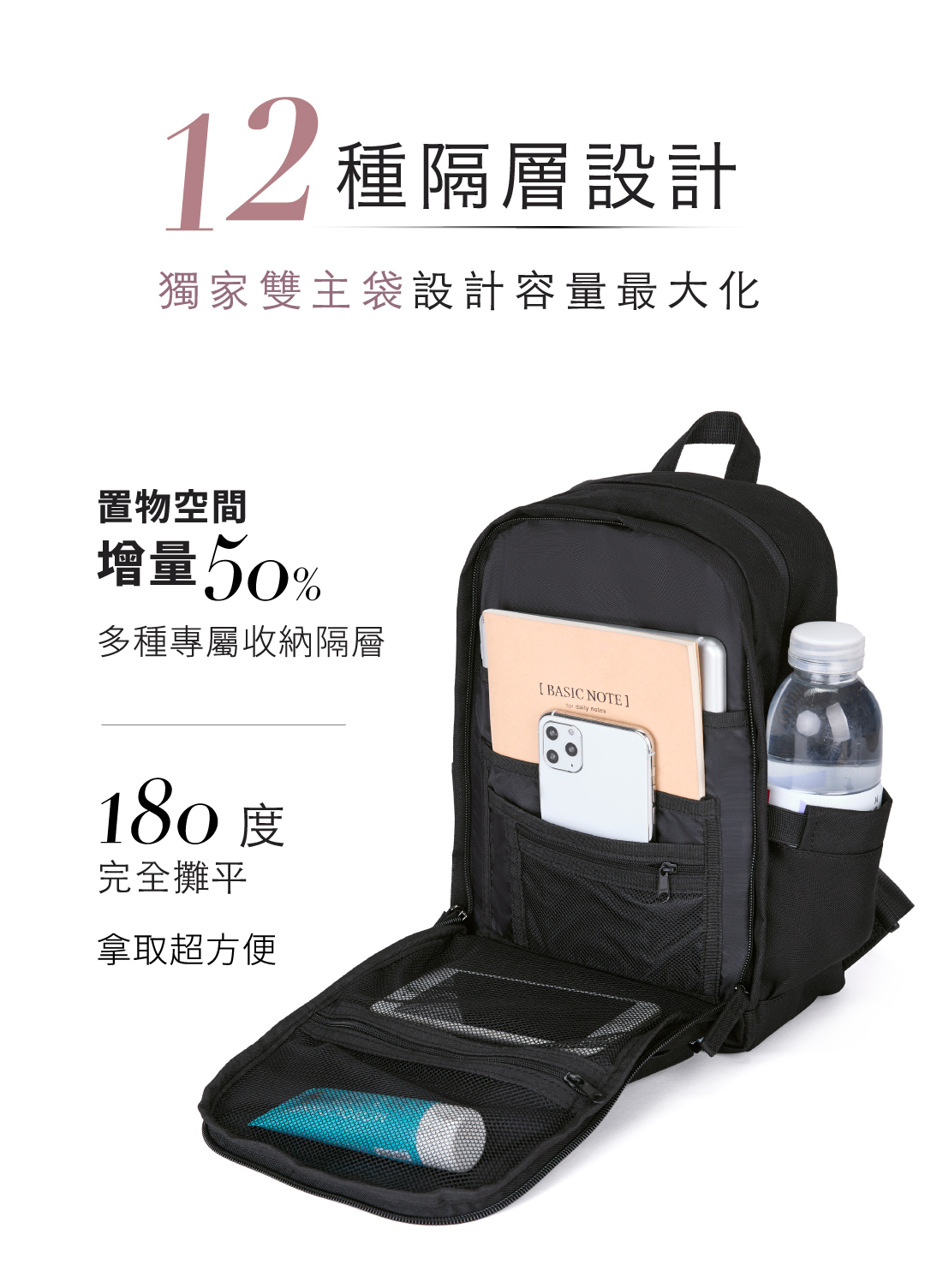 內層還有兩個水壺網袋設計,共四個水壺袋