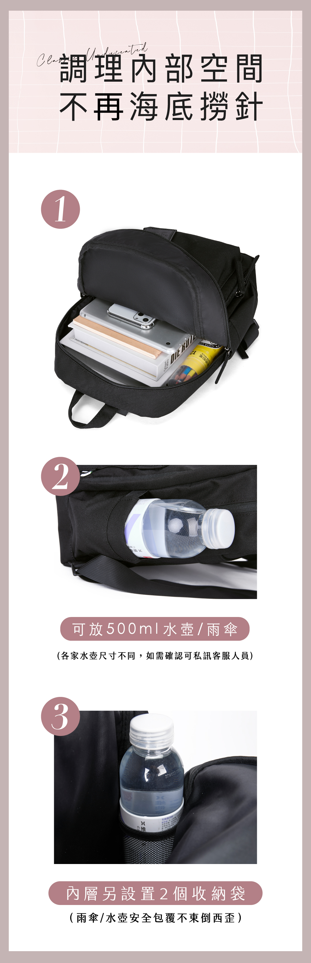 A:此款外側水壺袋為升級版設計,實測可放直徑約6cm左右的水壺 ( 市面上500ml的星巴克、象印、膳魔師之水壺皆可放置 )