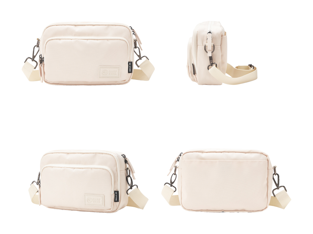 因布料特性問題,在戶外或光線明亮處,包包顏色會呈現較亮/白,如模特圖所呈現;而在室內或光線不足處,則會稍微偏米黃或淡粉,並非色差。