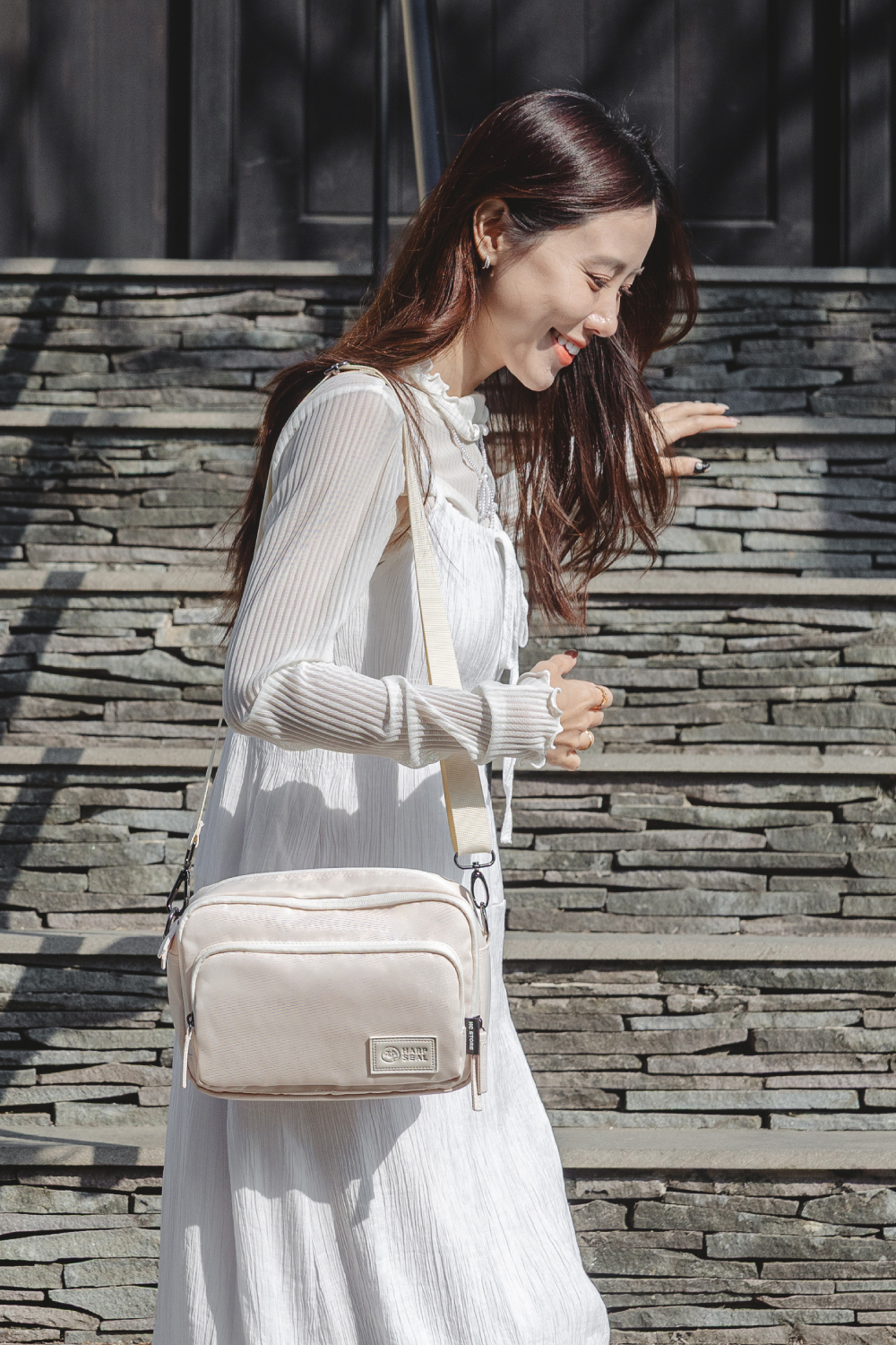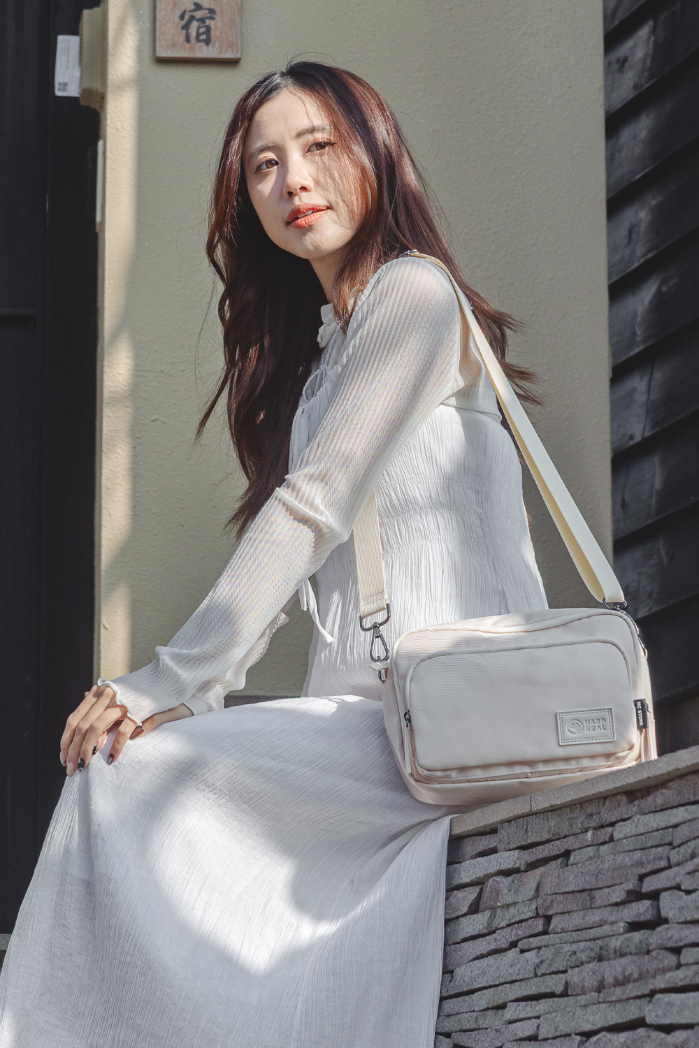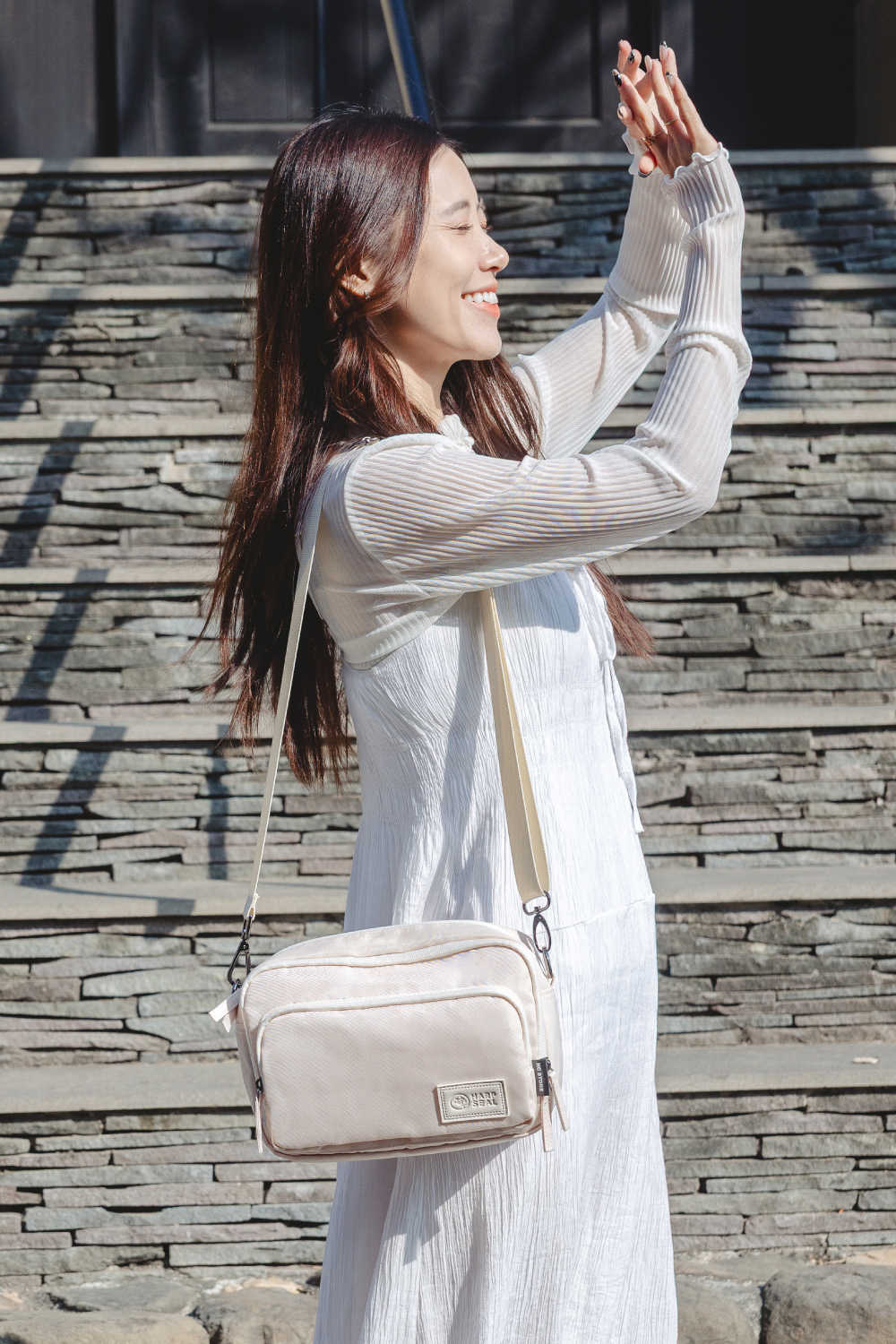 因布料特性問題,在戶外或光線明亮處,包包顏色會呈現較亮/白,如模特圖所呈現;而在室內或光線不足處,則會稍微偏米黃或淡粉,並非色差。