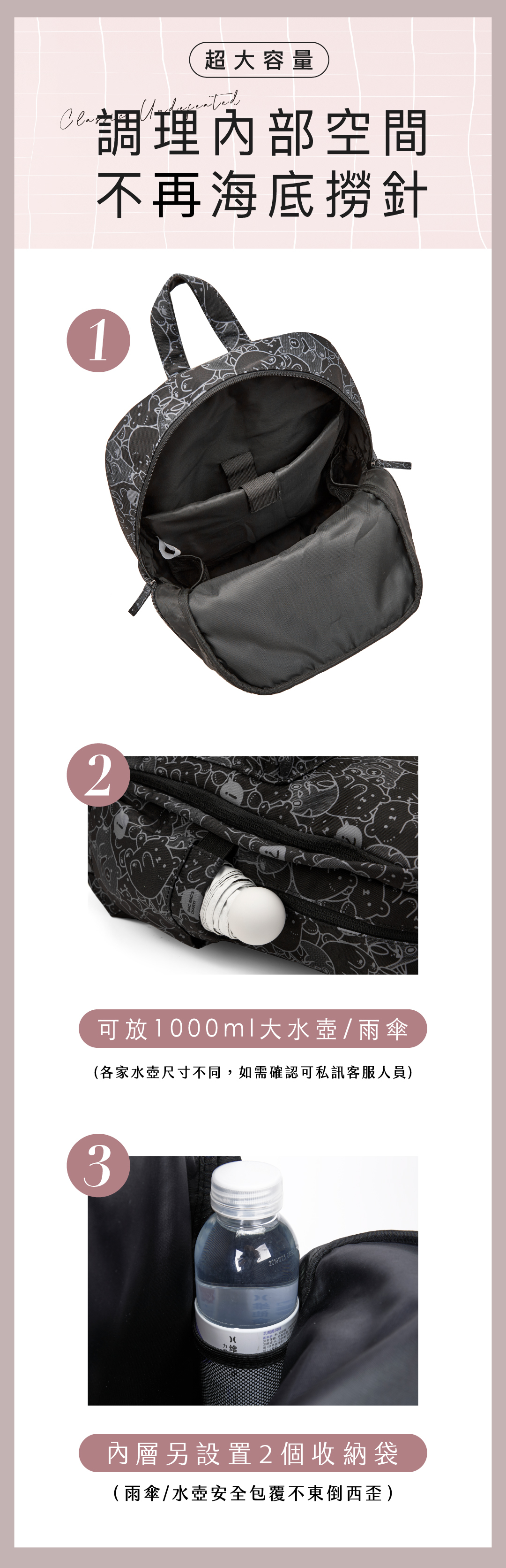 A:此款外側水壺袋為升級版設計,實測可放直徑約8cm左右的水壺 ( 市面上1000ml的星巴克、象印、膳魔師之水壺皆可放置 )